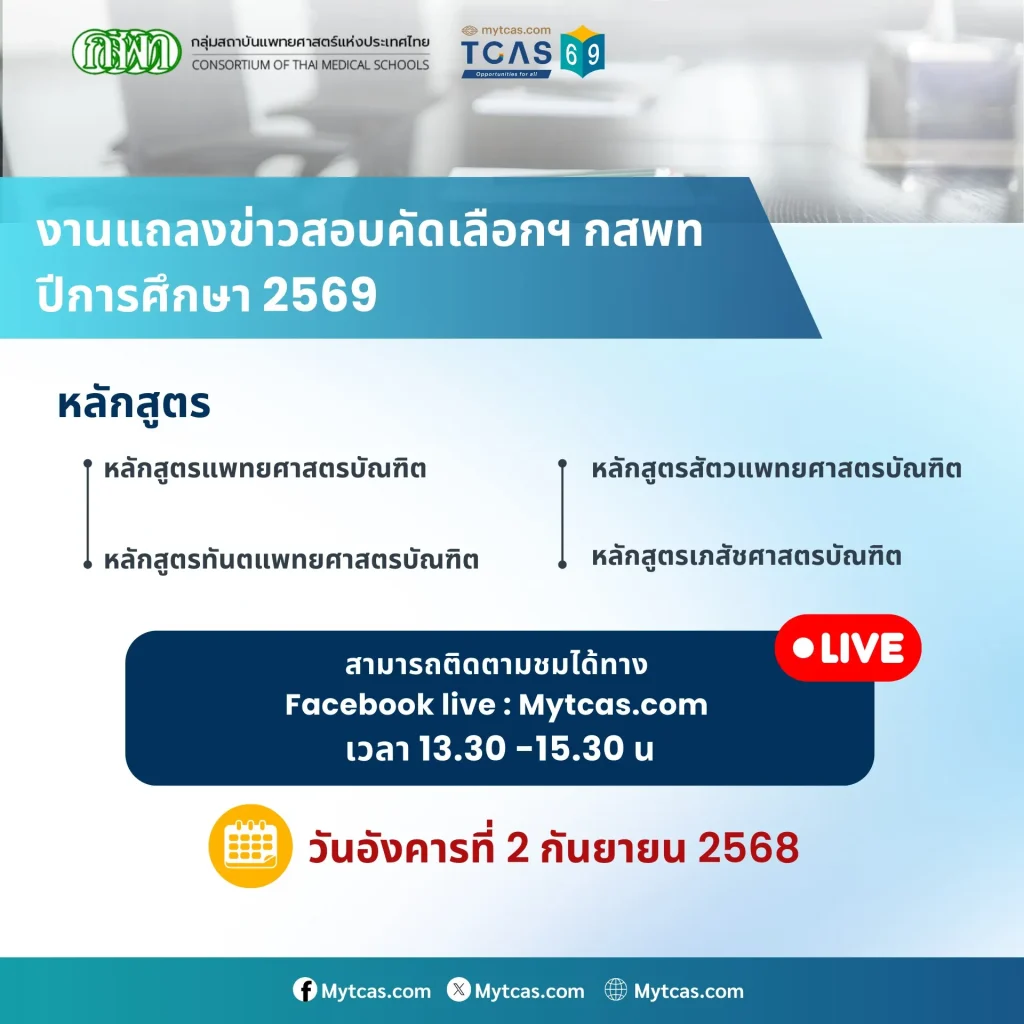 น้อง ๆ TCAS 69 ที่กำลังเล็งคณะสายแพทย์! กสพท. (กลุ่มสถาบันแพทยศาสตร์แห่งประเทศไทย) เชิญชวนติดตามการแถลงข่าวการสอบคัดเลือกเข้า 4 หลักสูตรสำคัญ ได้แก่ แพทยศาสตร์ ทันตแพทยศาสตร์ สัตวแพทยศาสตร์ และเภสัชศาสตร์